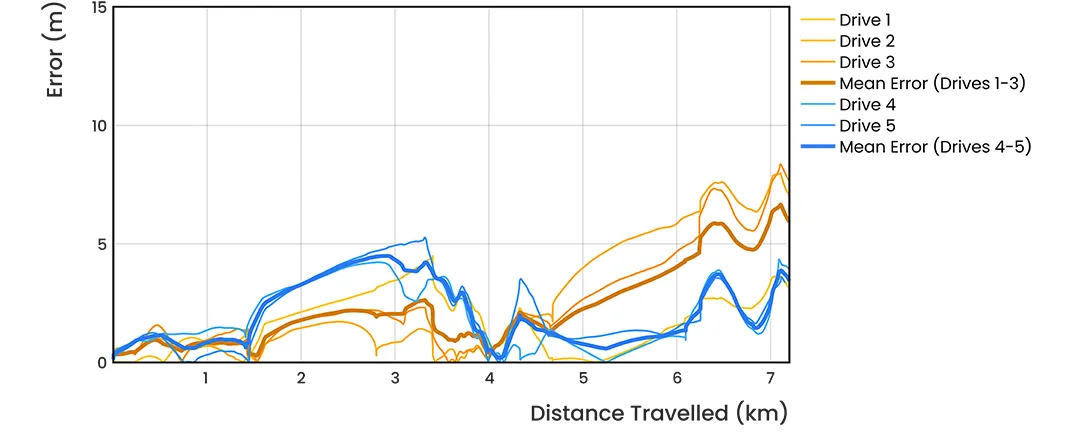 to assess the accuracy and resilience of the LVS Hybrid system, Advanced Navigation executed a series of rigorous real-world driving tests. Over five trials, the system achieved outstanding performance, with an average error of just 0.053% per distance traveled when compared to a GNSS reference.