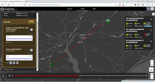 Effective link management and make-before-break connections between the two data links were accomplished using the uAvionix SkyLine UAS BVLOS cloud-based service and hardware, including a SkyStation5060POE GRS, two SkyStation5060LTE mobile GRS, a muLTElink5060 airborne radio system with the BT Drone SIM, and a uAvionix truFYX GPS installed on the aircraft. The flight also demonstrated the use of ADS-B OUT transmission from the aircraft on 978 MHz for Electronic Conspicuity, facilitated by a uAvionix microUAT device.