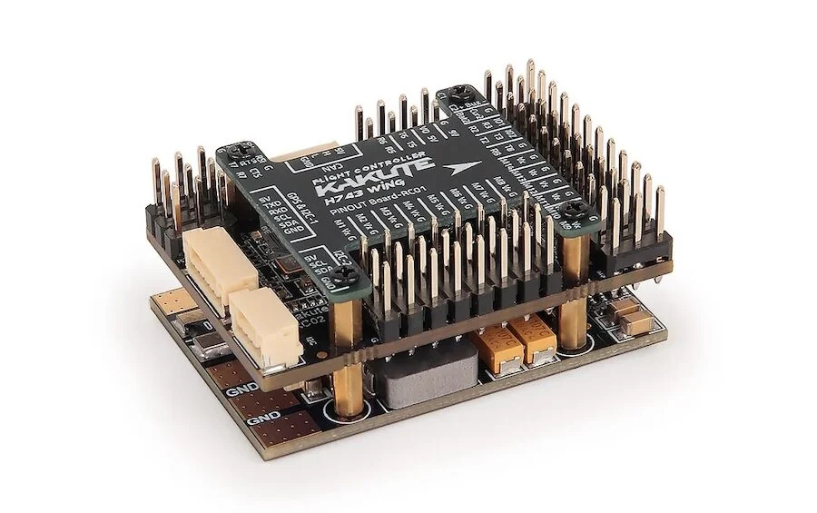 The Kakute H743 Wing is an advanced flight controller tailored for fixed-wing and VTOL (Vertical Take-Off and Landing) drones. It is powered by an Arm Cortex-M7 processor that supports ArduPilot firmware, ensuring high performance. The device is equipped with a sophisticated low-noise IMU (Inertial Measurement Unit) and offers a variety of I/O options, including UART, PWM, and I2C. Additionally, it seamlessly integrates with CAN devices and GPS modules.