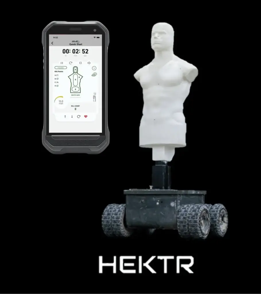 With the ability to reach speeds over 20 mph, HEKTR can simulate the movements of a human adversary in both outdoor and indoor environments.It is equipped to detect gunfire and relay real-time training assessment data to a mobile submission, enabling trainees to receive immediate feedback and refine their tactical skills in a controlled setting.