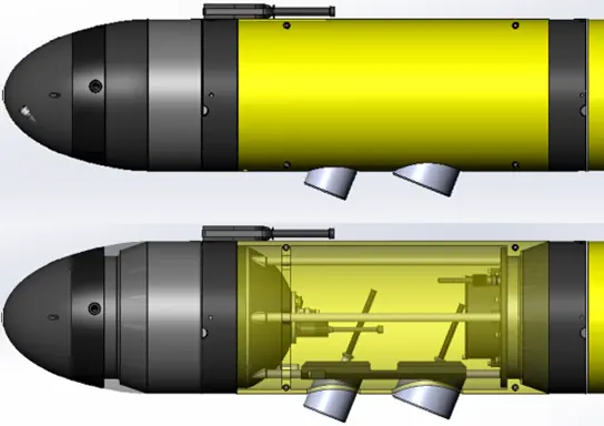 The integration of the EK80 into the Slocum Glider involves housing the WBT Mini electronics within a pressure vessel located in front of the glider’s buoyancy engine, just behind the sonar dome. Two transducers are positioned in a flooded wet bay between this pressure vessel and the glider’s front section. Users can choose from transducer frequency options of 120kHz / 200kHz or 200kHz / 333kHz, with configurations for either upward or downward facing.